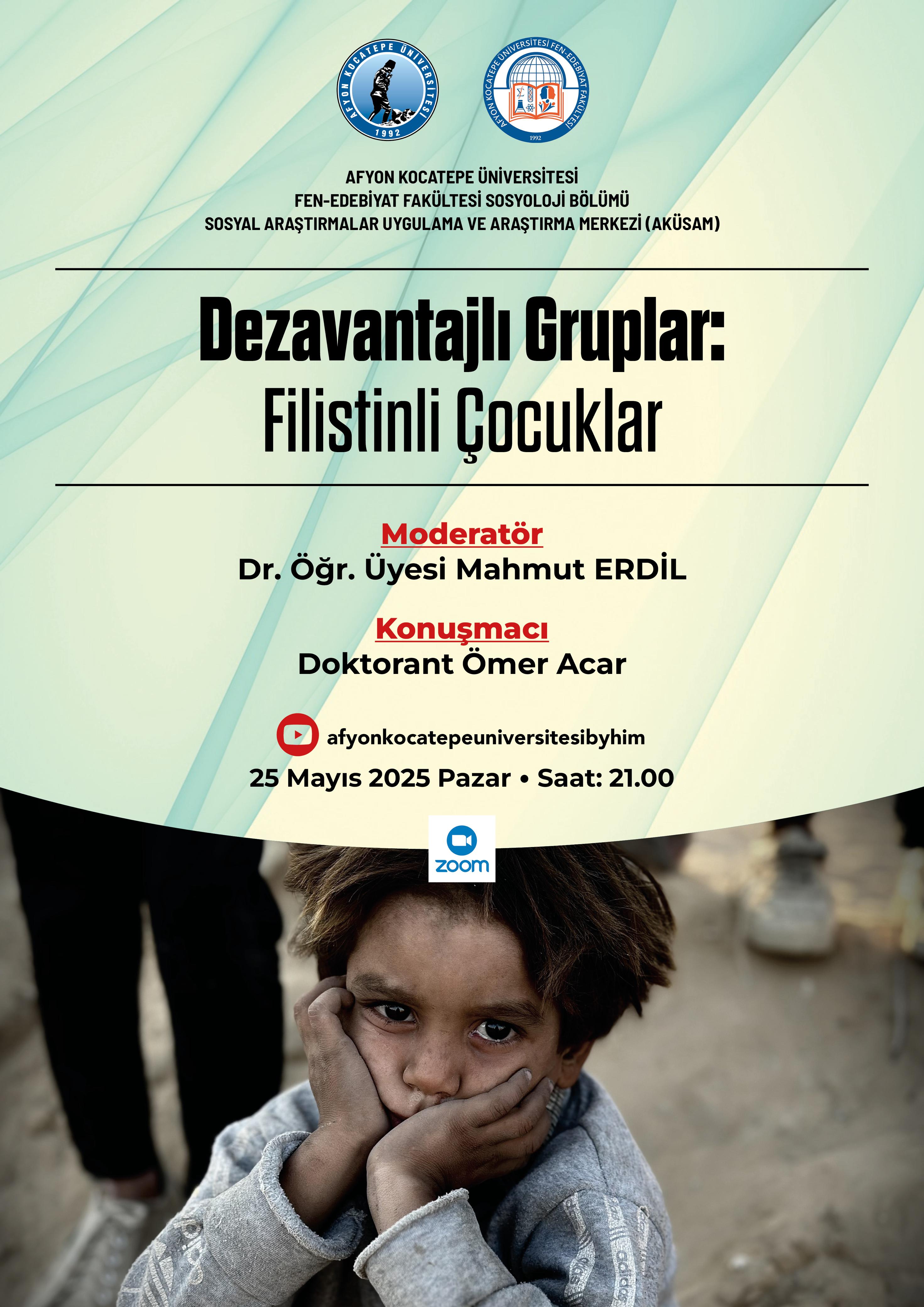 Dezavantajlı gruplar Semineri 2 için Sosyoloji Doktorantı Ömer Acar Gazze’de ki Çocukların dezavantajlı konumlarını ele aldı. Gelinen noktada uluslararası müdahalenin yapılması gerektiğini vurguladı. Çocukların toplum için korunması gereken bir kesim olduğunu, acil bir şekilde Gazze’de çocukların ölümünün önüne geçilmesi gerektiğini söyledi. Bu konuda hazırladığı kitap bölümündeki bilgileri izleyicilerle paylaştı.